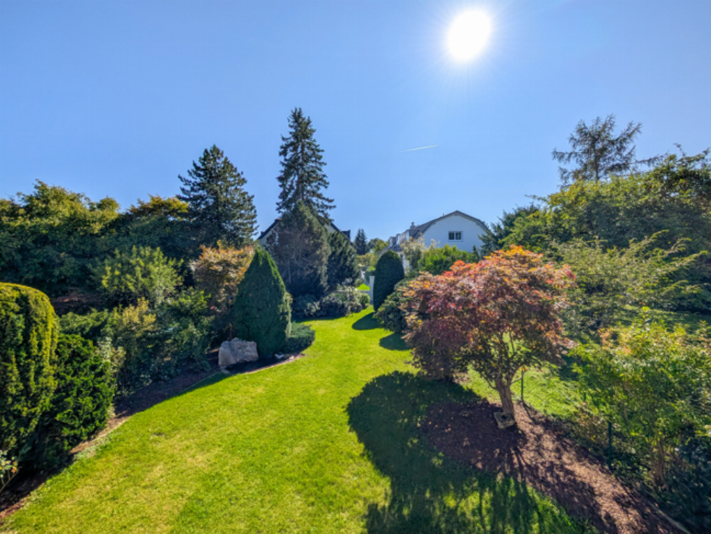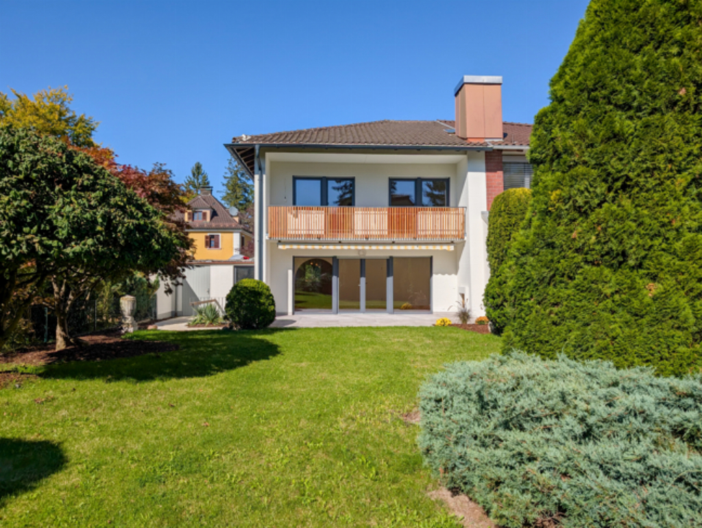 Nach der umfassenden Erneuerung im Jahr 2025 erstrahlt das Haus in neuem Glanz und kombiniert traditionelle Architektur mit hochwertiger Wohnqualität. Besonders hervorzuheben ist der liebevoll angelegte, alteingewachsene Garten mit beeindruckendem Baumbestand und einem idyllischen Teich. Über die großzügige, moderne Terrasse in edler Betonoptik gelangen Sie direkt in dieses grüne Paradies, das wie eine private Oase wirkt. Auch der Außenkamin sorgt an kühleren Abenden für eine besonders stimmungsvolle Atmosphäre im Garten.