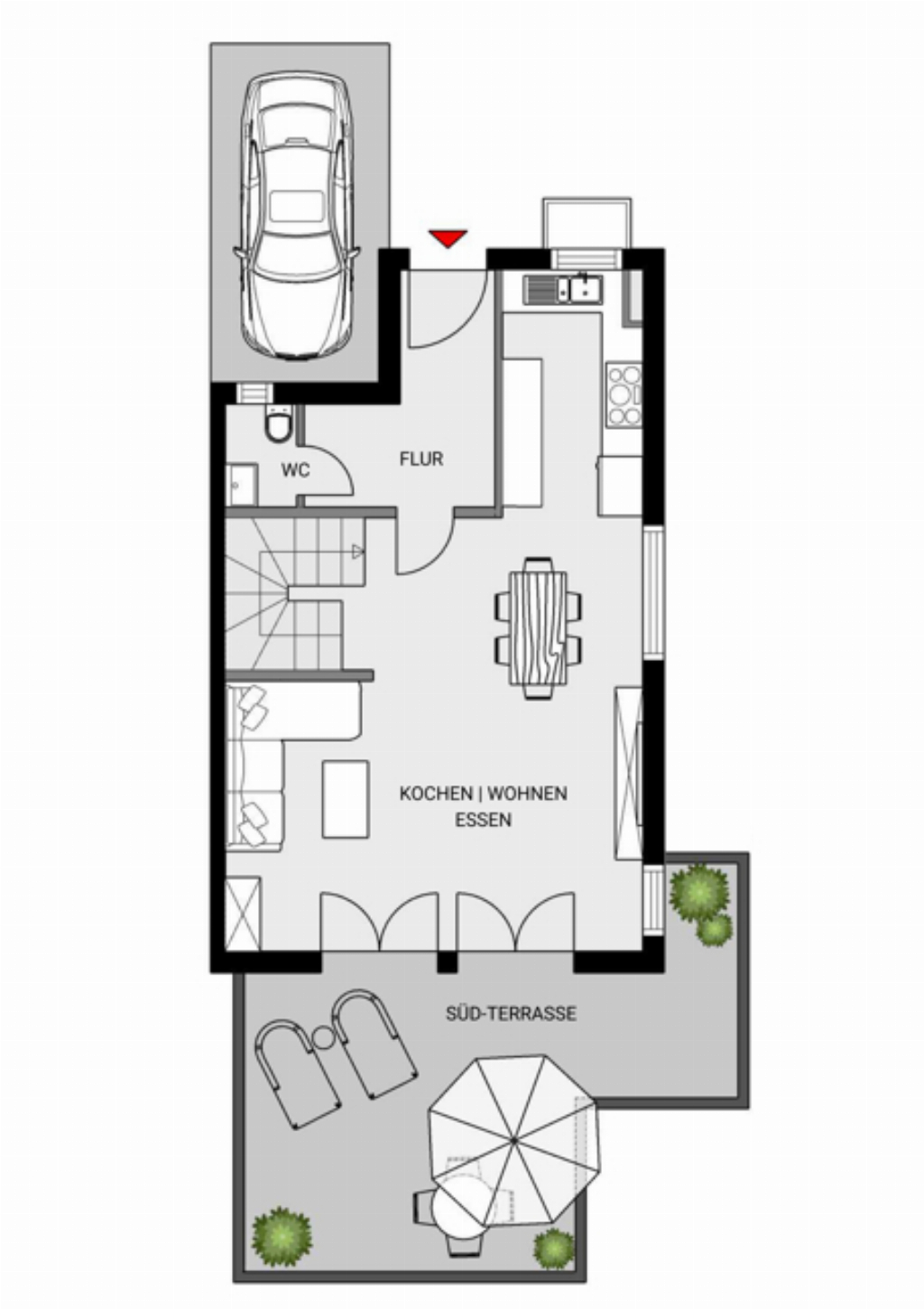Schon beim Betreten entsteht ein Gefühl von Ruhe und Geborgenheit. Der Eingangsbereich ist offen und freundlich gestaltet und bietet ausreichend Platz für Garderobe, Schulranzen oder Kinderwagen – ein Ort, an dem man gerne nach Hause kommt. Von hier aus öffnet sich das Erdgeschoss zum zentralen Wohnbereich – dem lebendigen Mittelpunkt des Familienalltags.