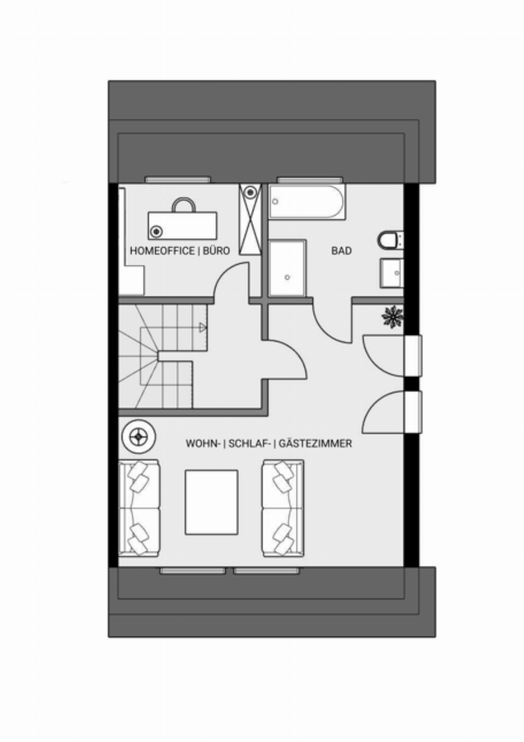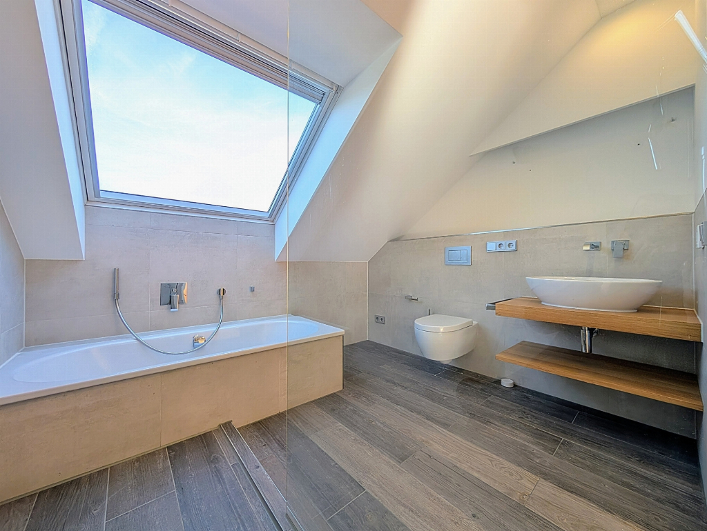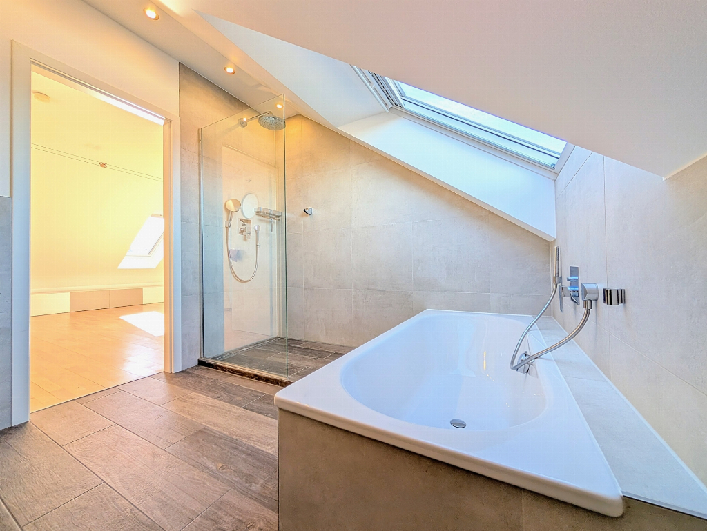 Das vollständig ausgebaute Dachgeschoss erweitert das Raumangebot um einen weiteren, lichtdurchfluteten Bereich mit eigenem Bad. Diese Ebene passt sich flexibel an unterschiedliche Lebensphasen an und eignet sich hervorragend als Jugendzimmer, Homeoffice, Gästezimmer, kreativer Rückzugsort oder auch als separater Elternbereich.