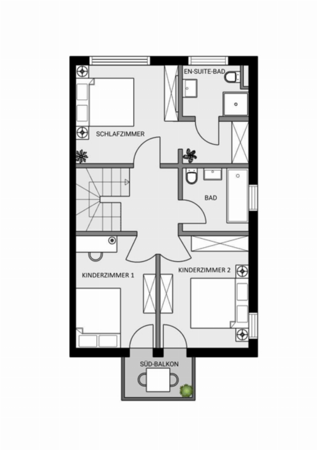 Im Obergeschoss liegen die privaten Rückzugsbereiche der Familie. Die Zimmer sind gut proportioniert und bieten Kindern wie Erwachsenen Raum zum Wohlfühlen – sei es als Schlafbereich, Spielzimmer oder ruhiger Ort zum Lernen. Das Elternschlafzimmer mit Balkonzugang lädt dazu ein, den Tag mit frischer Luft zu beginnen oder am Abend entspannt ausklingen zu lassen.